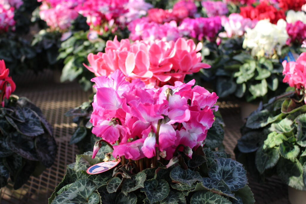 シクラメンは、毎年11月25日前後から約1カ月間、直売を行っております。 クリスマスプレゼントや年末の贈答品としても人気がございます。
